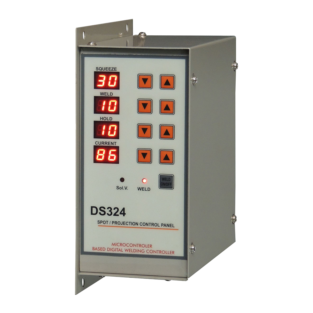 T The DS324 is simplest and easy operate spot welding and projection welding controller with digital parameter setting. The squeeze, weld, hold timer and weld-current value is directly settable by their ideal tactile switches. All set parameters are retain in memory. The inbuilt firing circuit gives hassle free quick installation.