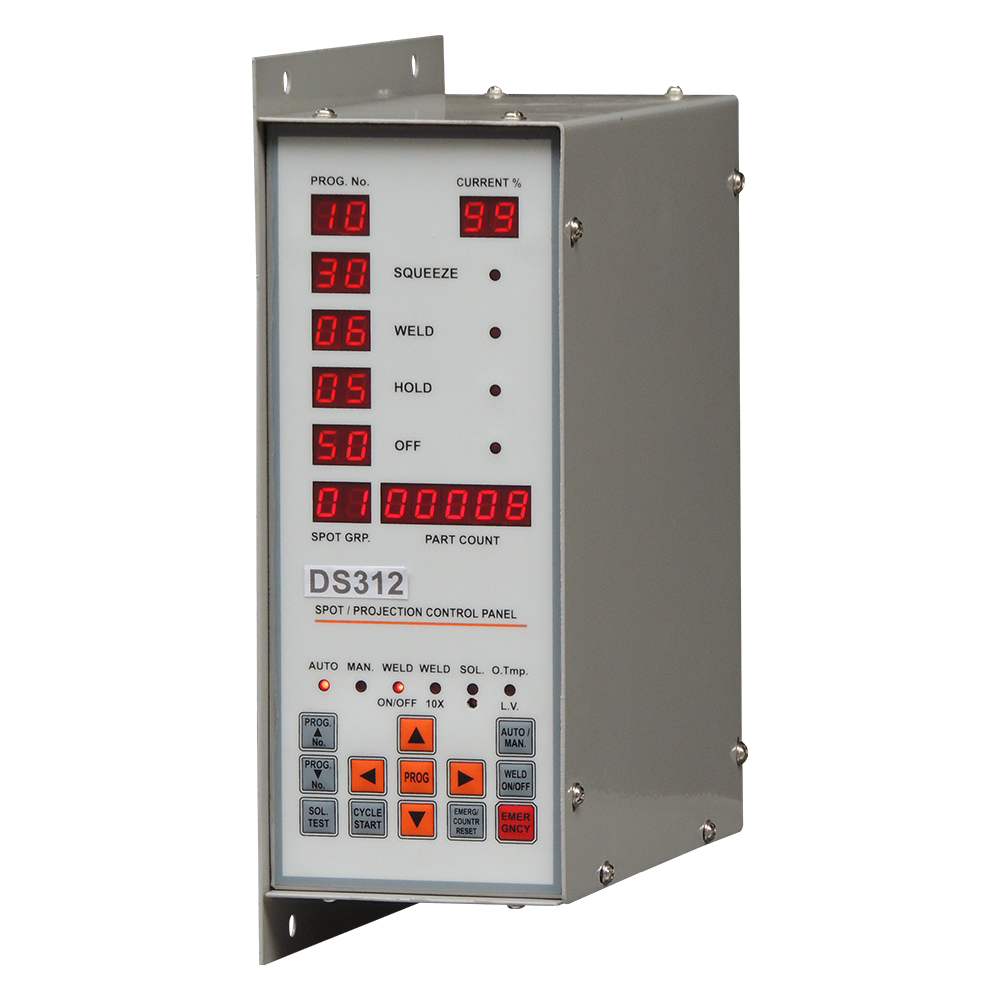 The DS312 panel is made for double head projection welding machine that is used to save connected electric supply by placing two operators on a projection welder, when one operator is preparing job to weld the other operator can weld same job on second head. The weld time is configurable to 1x or 10x weld time and panel has thermostat input to protect machine in case of over-heat due to overload or water failure.