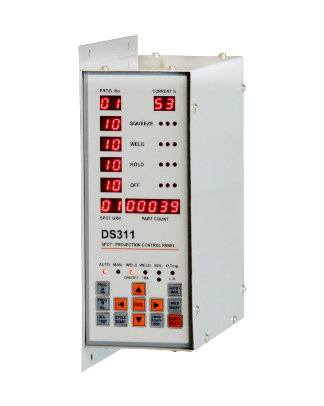 DS309 is most selling economic spot welding controller. Have 10 Program memory. Each program stores Squeeze time, weld time, hold time, off time, Electric current and pert count values. The current control setting is the Thyristor phase angle trigger setting.