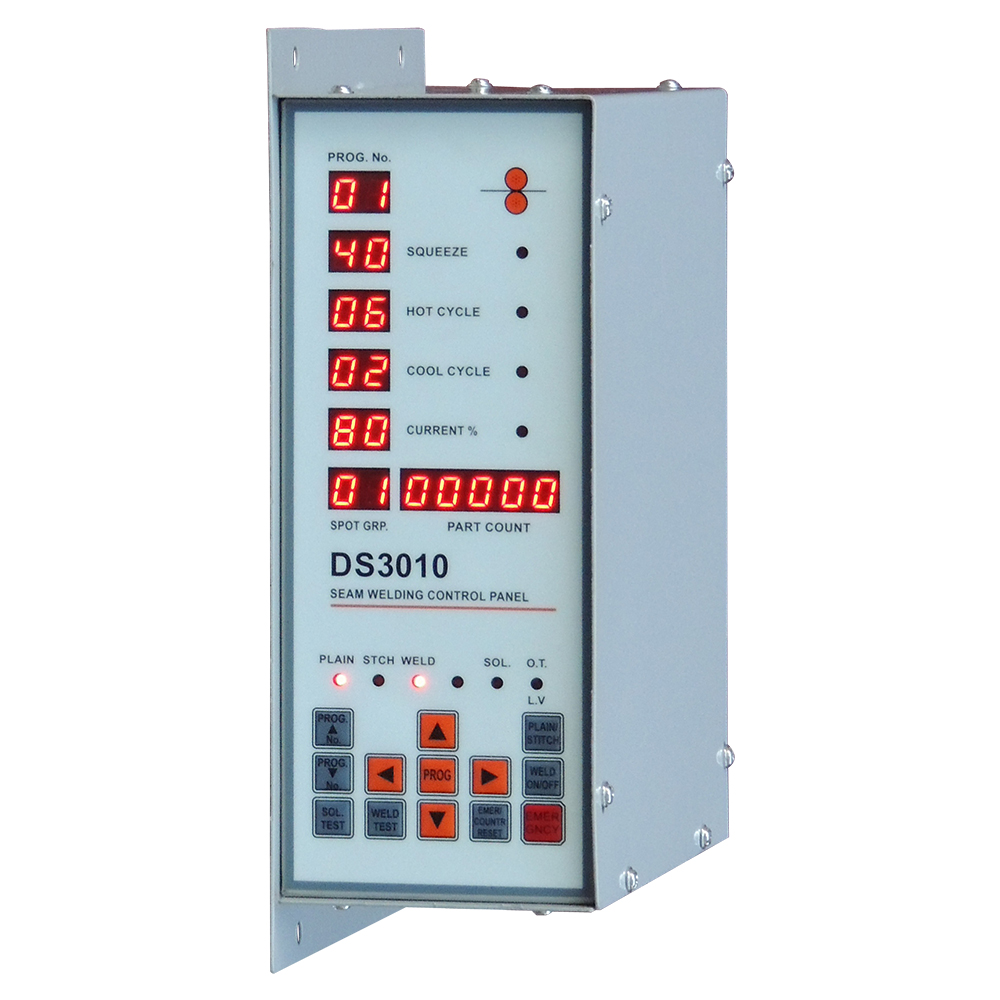 DS3010 is digital synchronous control panel for seam welding machines with group setting for multiple welds on a item and counter for each program and 10x weld time configurable and thermostat connections for over-temperature safety.
